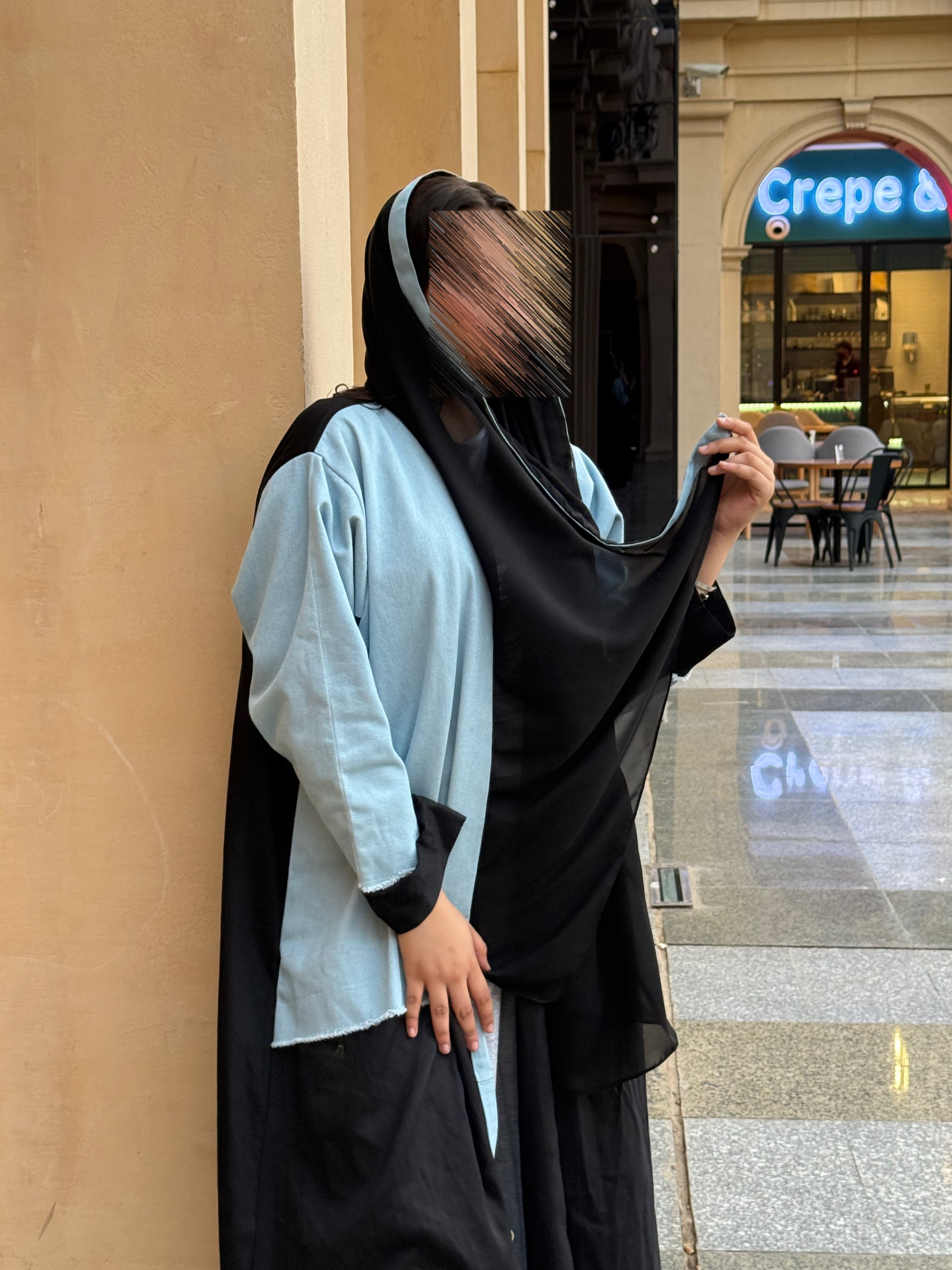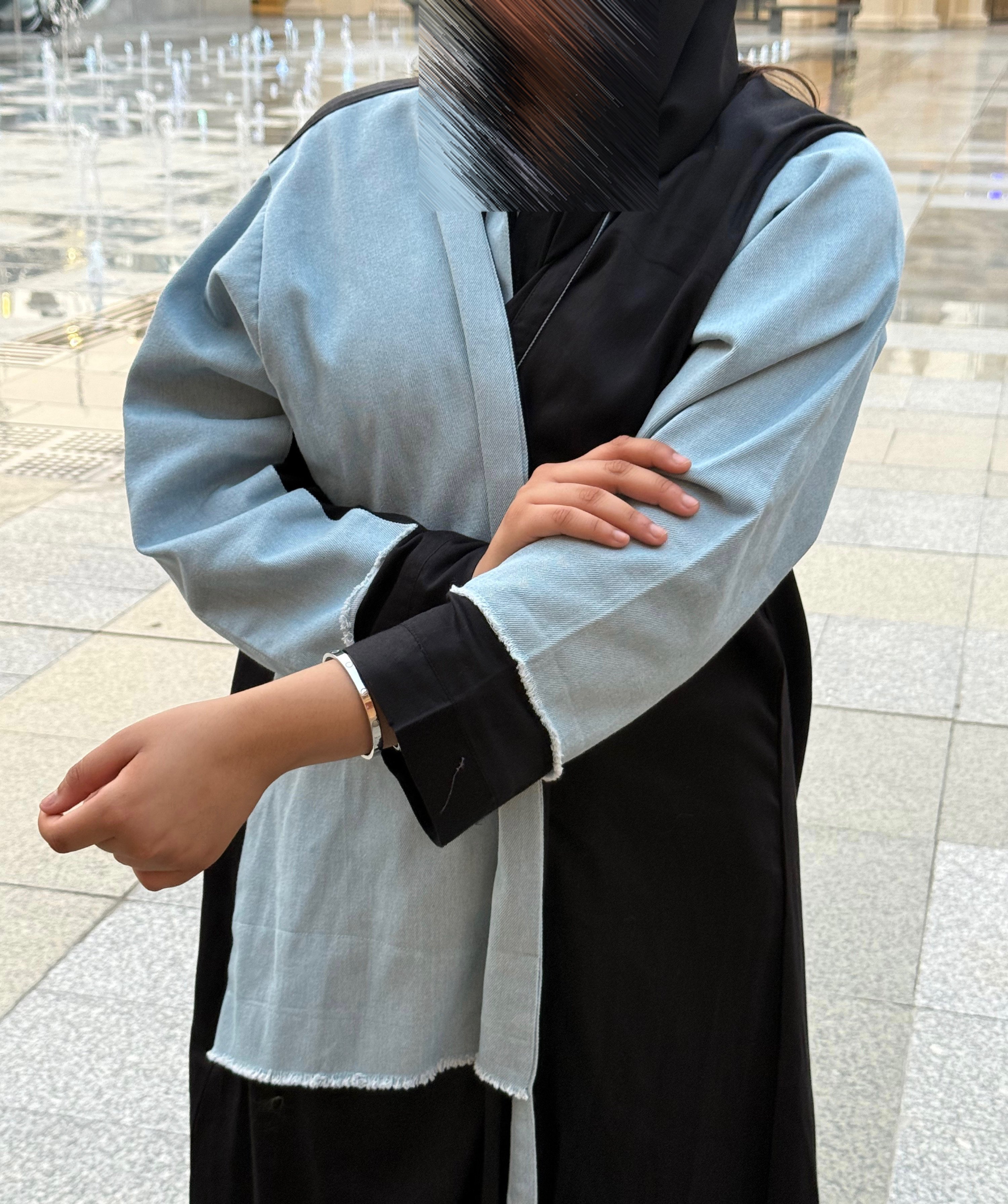 عباية كاجوال بقماش قطن هندي أسود مع جنز فاتح، تجمع بين الراحة والأناقة. مناسبة لفصل الصيف بفضل خامتها الباردة والعملية، متوفرة بجميع المقاسات مع طرحة بحافة جنز تكمل الإطلالة اليومية بكل سهولة.