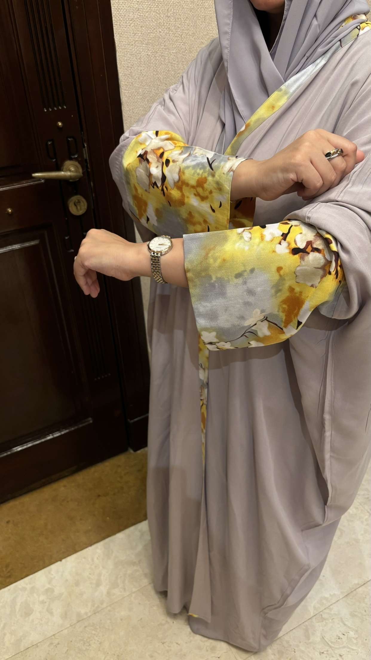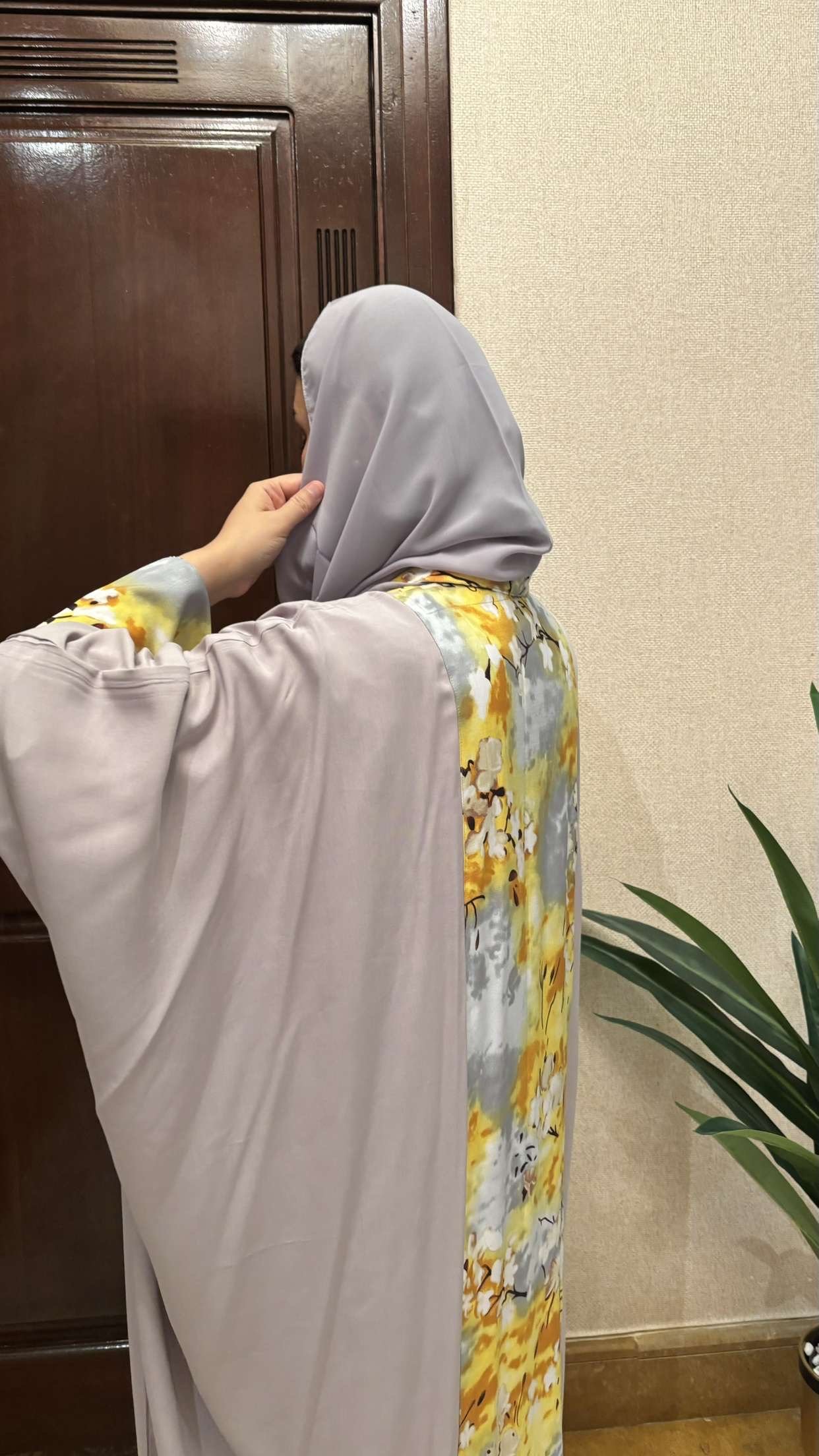 عبايه صيفي بتصميم مريح وأنيق، مصنوعة من مزيج قماش رايون قطن رمادي فاتح وقماش مشجر بألوان الخريف الرمادية مع لمسات من اللون المنقاوي. قصة الفراشة واللف تجعلها مثالية للراحة والبرودة في الأيام الحارة.