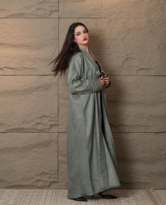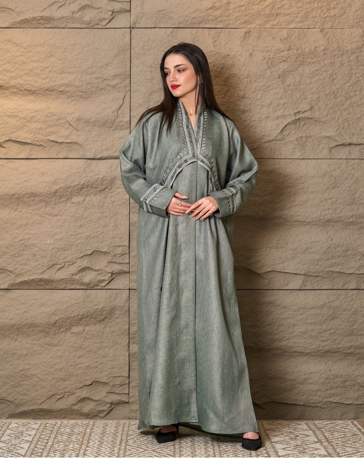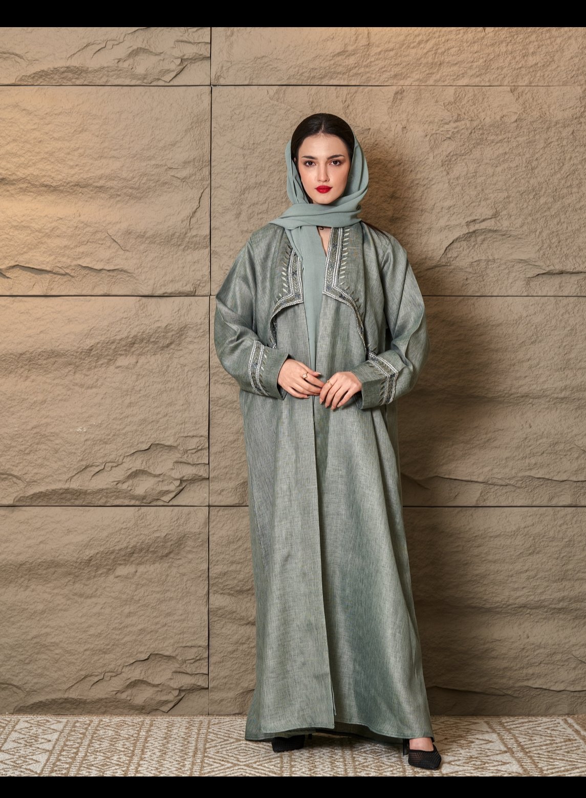 عبايات كشخة بتصميم أنيق وقماش لينين مريح، قصة سديري من الأعلى مزينة بتطريز ورود خيوط يدوياً على الصدر والأكمام. متوفرة بألوان الفستقي الفاتح والأسود مع طرحة متناسقة لكل لون، بدون طقطق.