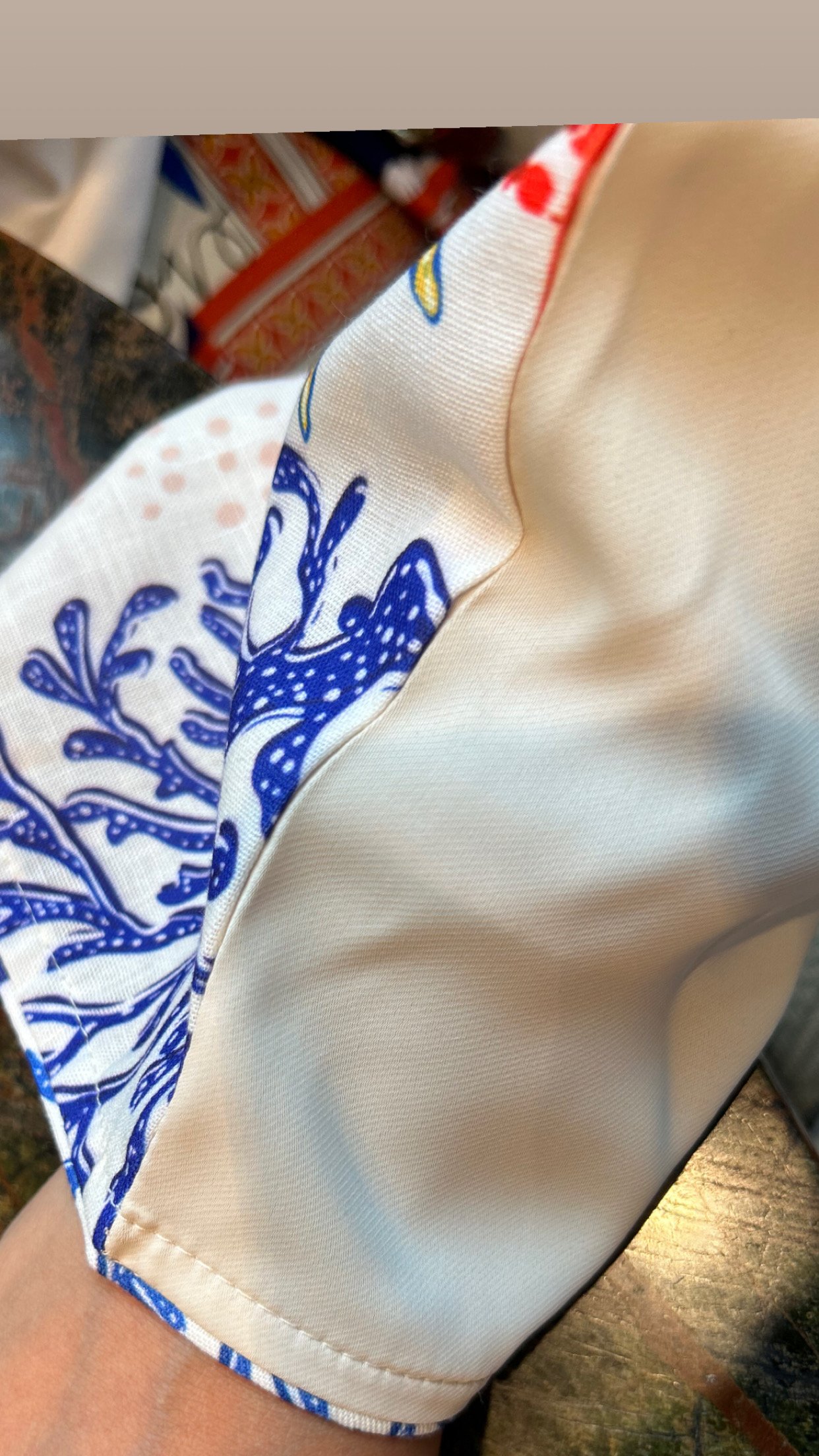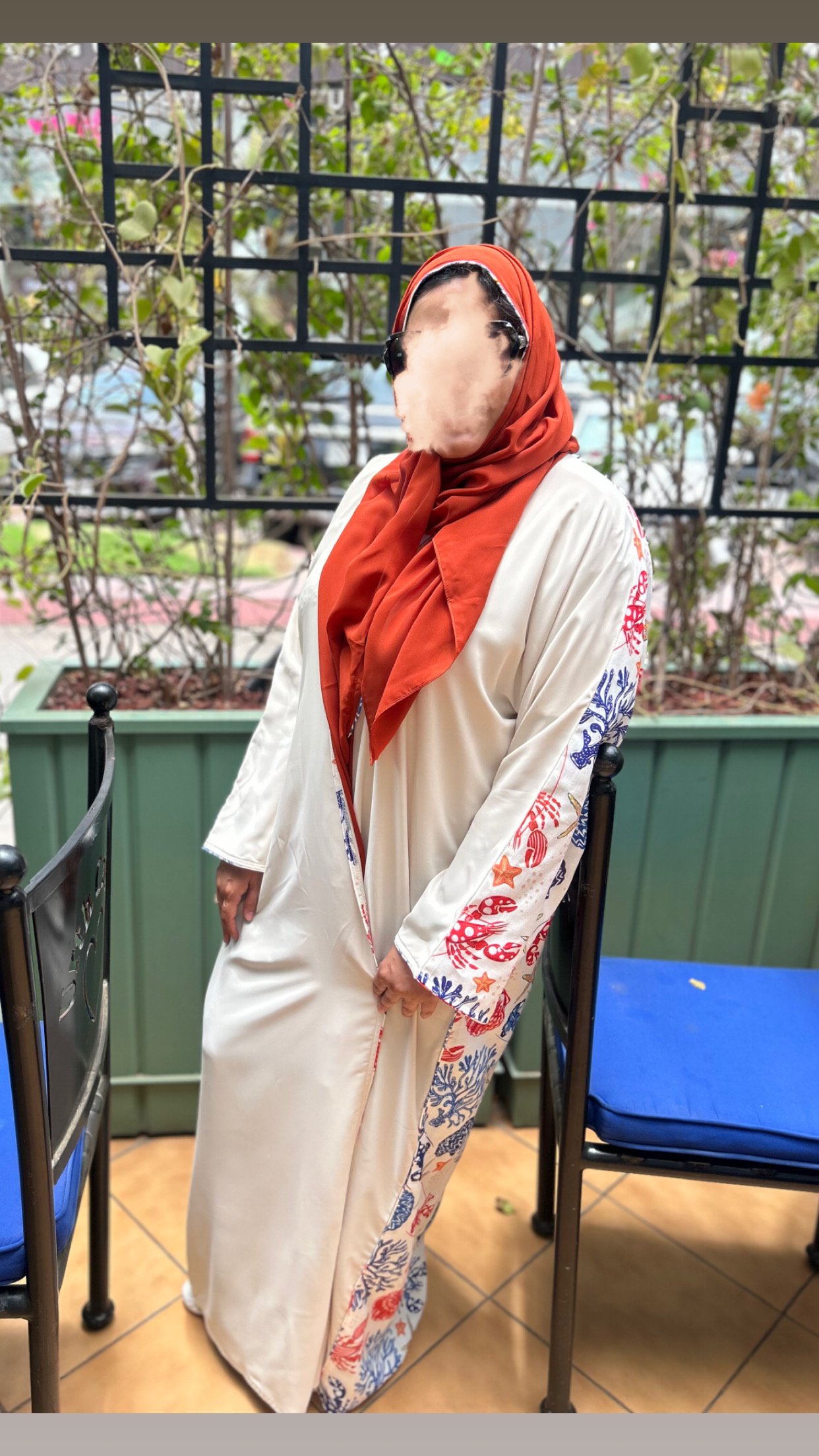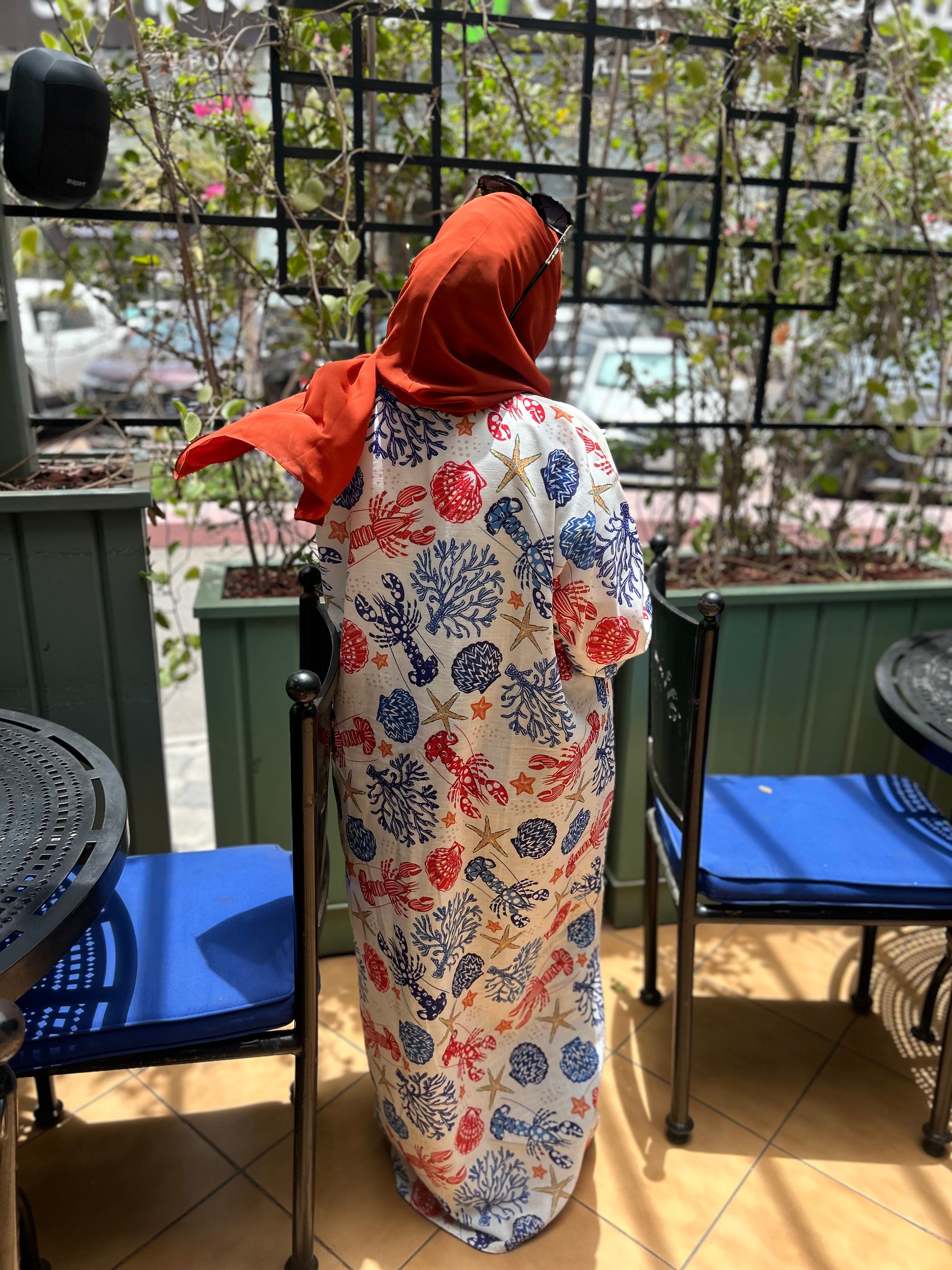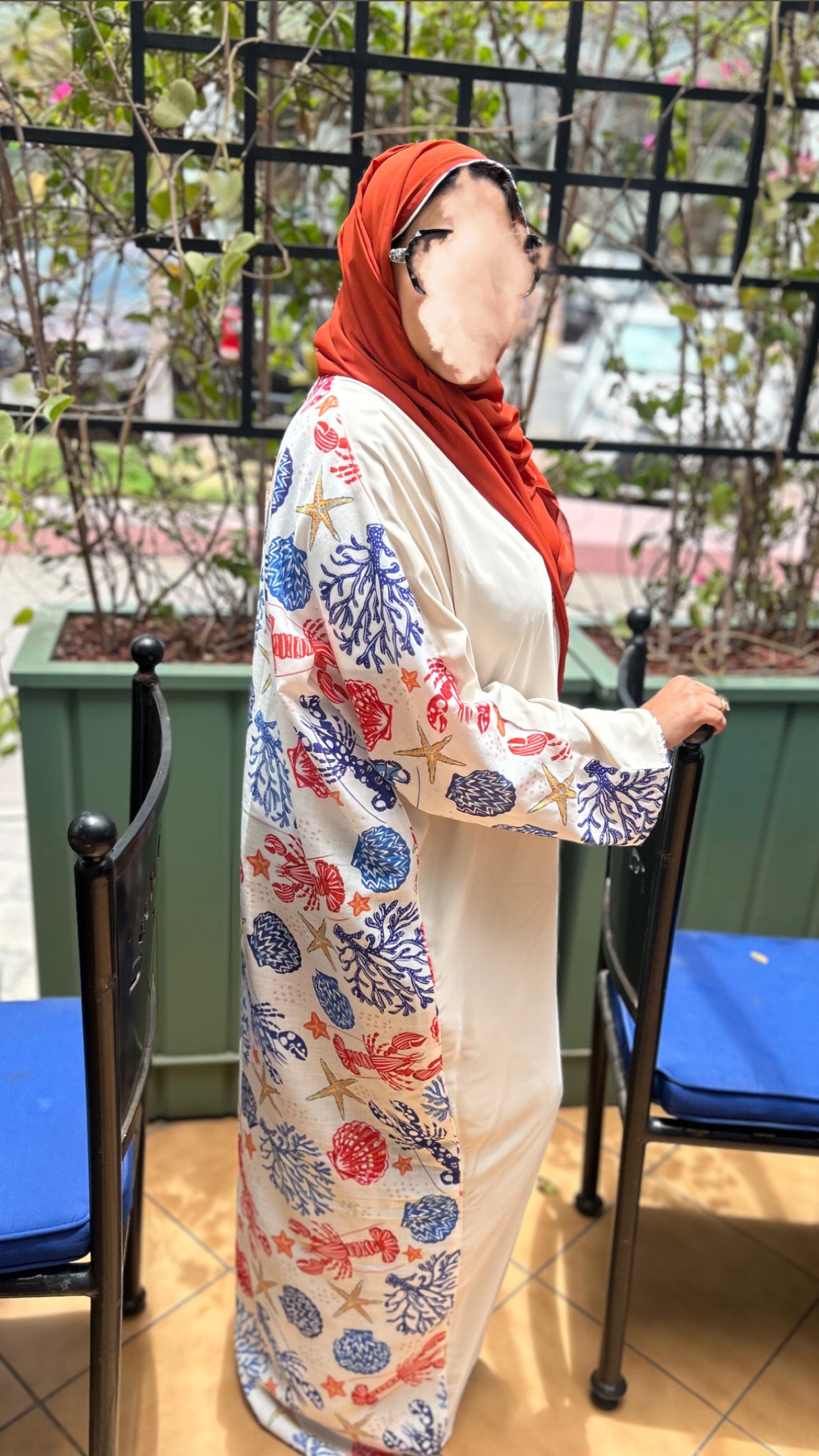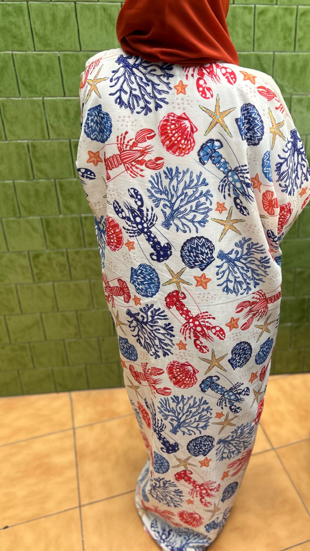 عبايه بحر خفيفة ومنسمة كنسيم البحر، مزينة برسومات سرطان البحر، النجوم وأصداف البحر على قماش الكتان الطبيعي (اللينن) مع كريب بارد بلون الأوف وايت. تمنحك تهوية ممتازة وأناقة انسيابية مناسبة لجميع أشكال الجسم.
