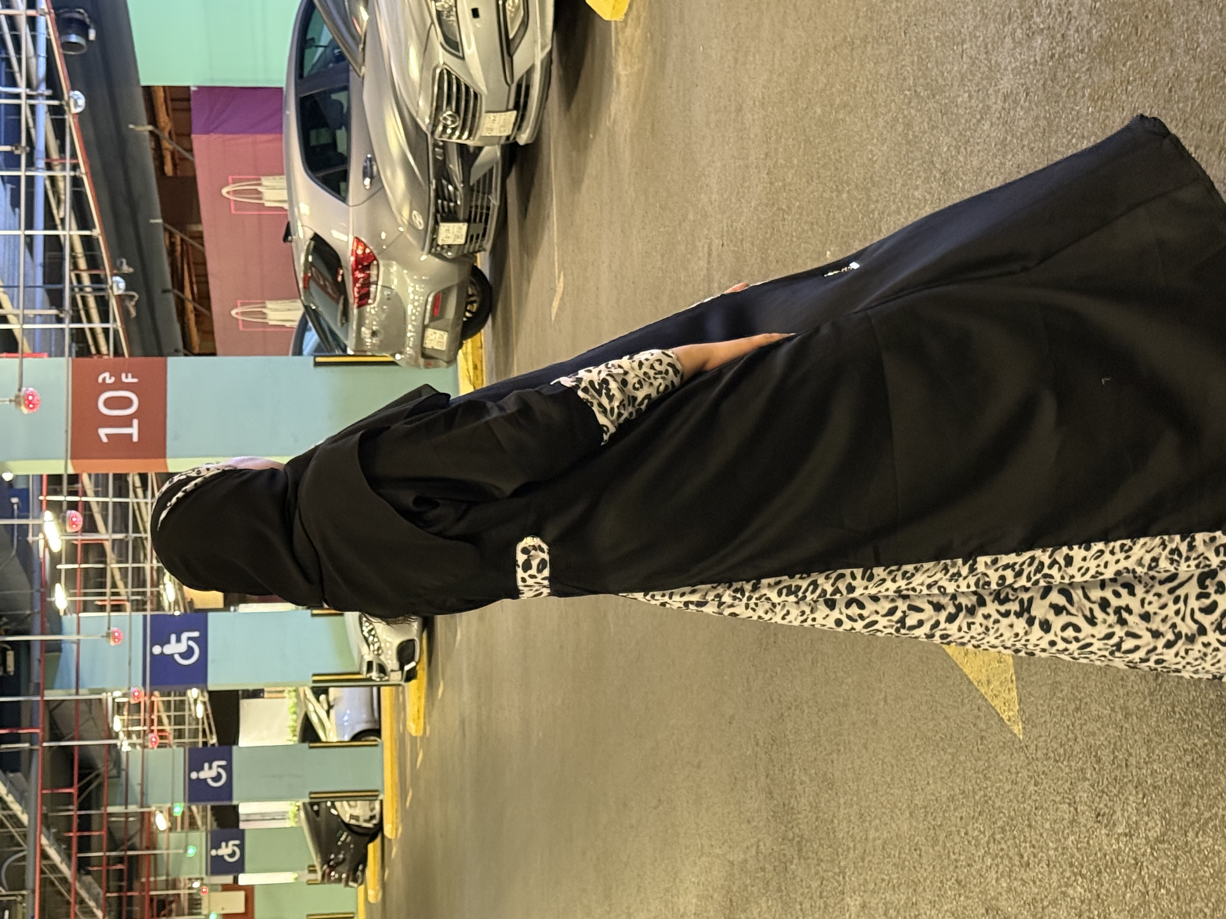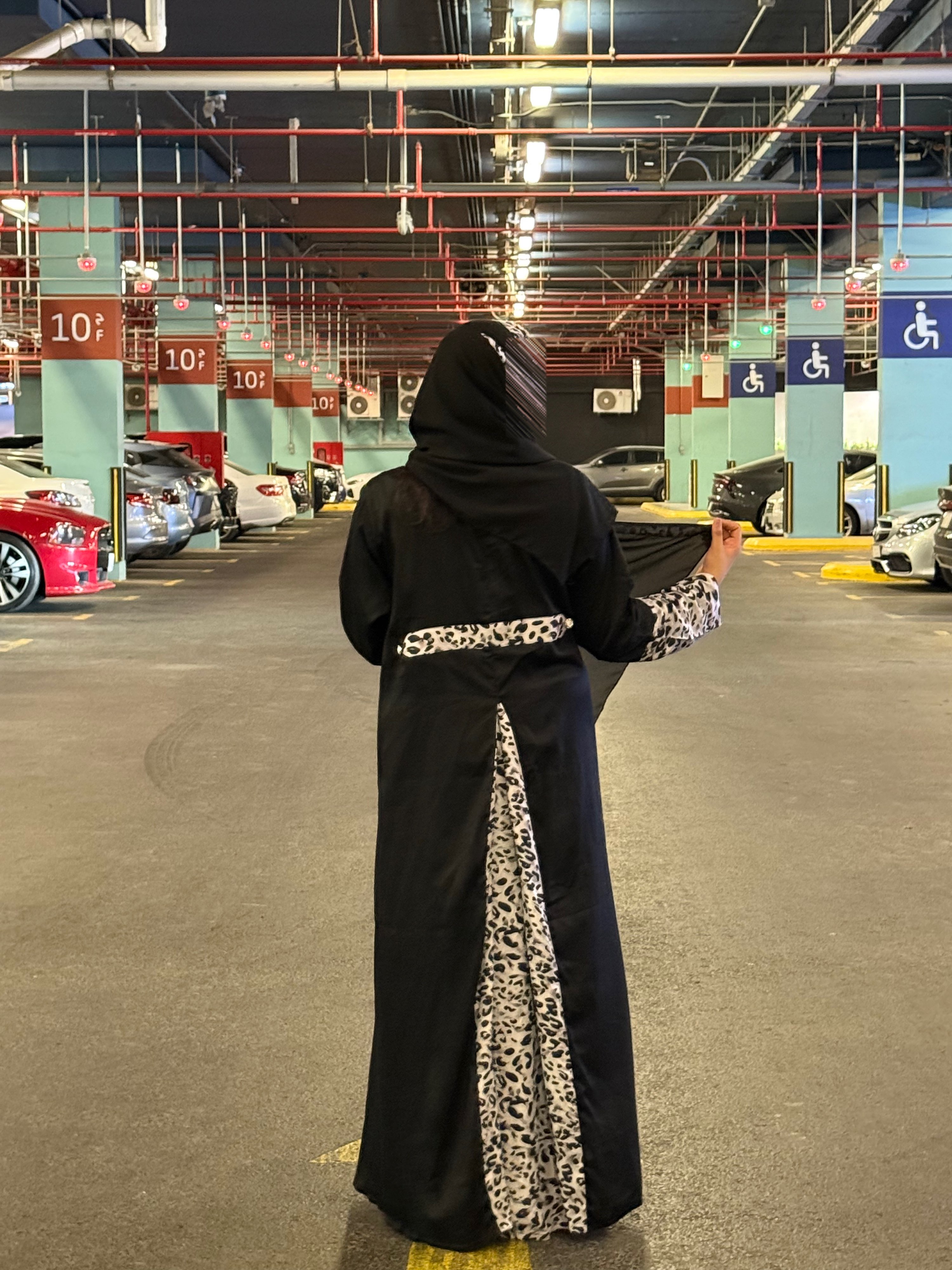 عباية غسق الدجى بتصميم أنيق وعصري، تجمع بين الراحة والجودة. مصنوعة من قماش قطني هندي بارد مع تفاصيل جلد النمر الأبيض والأسود، مثالية لفصل الصيف والنهار. متوفرة بجميع المقاسات مع طرحة ليز سوداء بحافة جلد النمر.