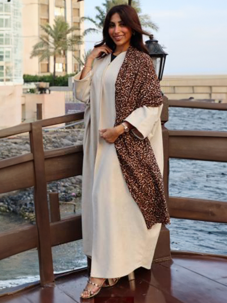 عباية شتوية مشلح أنيقة مصنوعة من قماش الشمواه البيج الفاخر، مع بشال خفيف مزين بجلد النمر يضيف لمسة عصرية ودافئة. تصميم عملي وأنيق مثالي لأيام الشتاء الباردة مع الحفاظ على الراحة والفخامة.