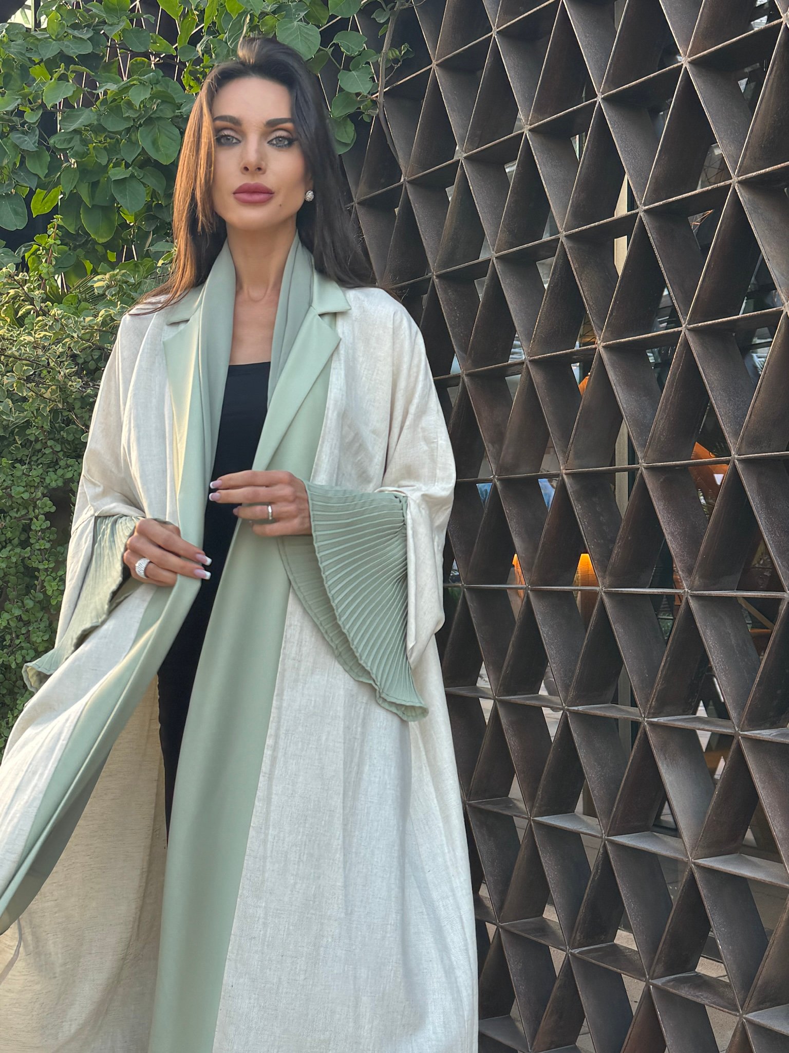 كوني صانعة حكاية أناقتك مع عباية ملونة بقماش كتان بارد مثالي للصيف، تصميم أنيق يبرز جمال طلّتك في كل مناسبة. أكمام واسعة من قماش بوليستر فستقي مع زيق عريض من الستان يضيف فخامة، بدون قفلة، مع طرحة فستقي وبروش هدية.