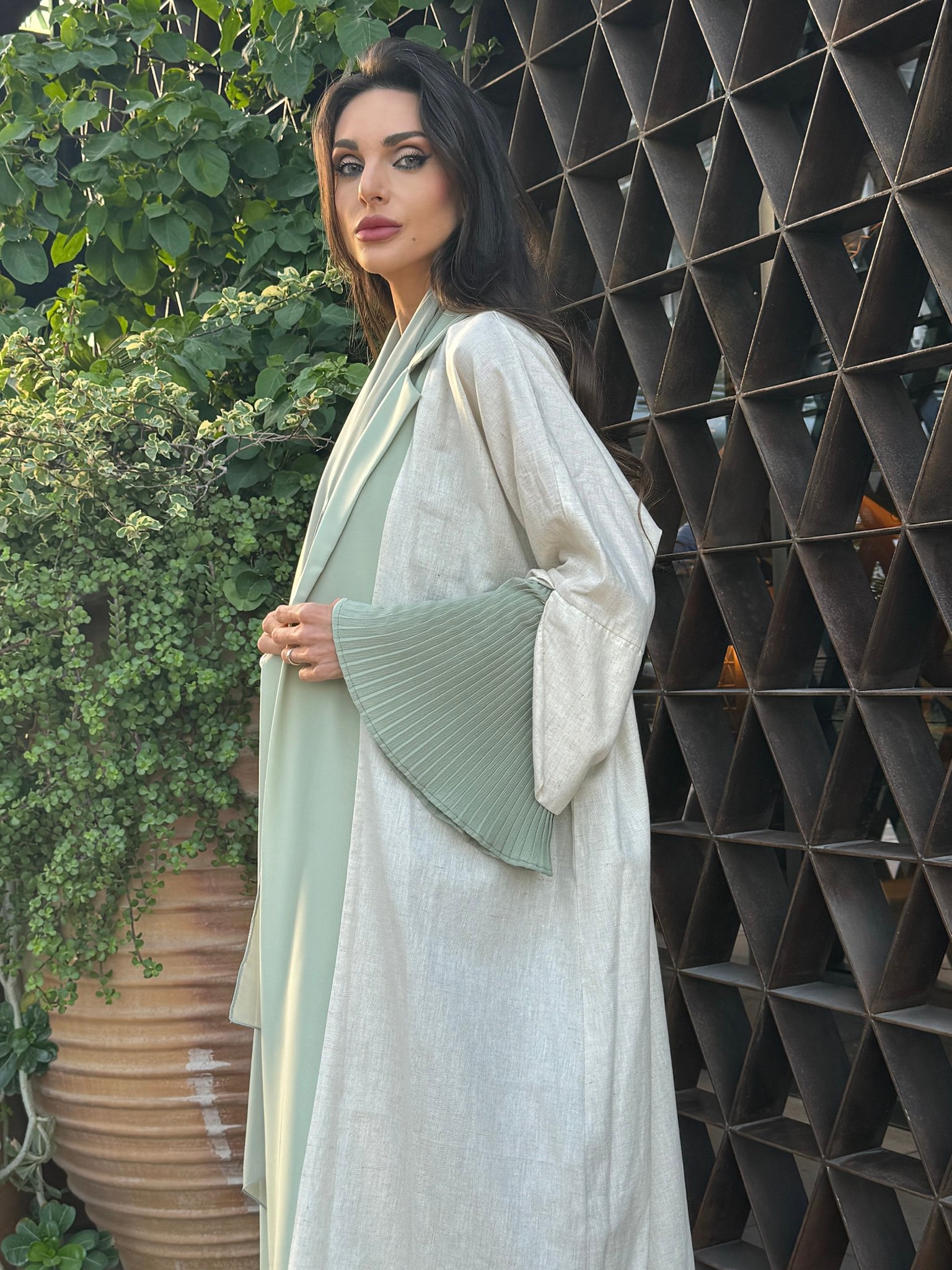تميزي الآن مع عباية فستقي الصيفية من ain-abayet واحصلي على إطلالة لا تُنسى.