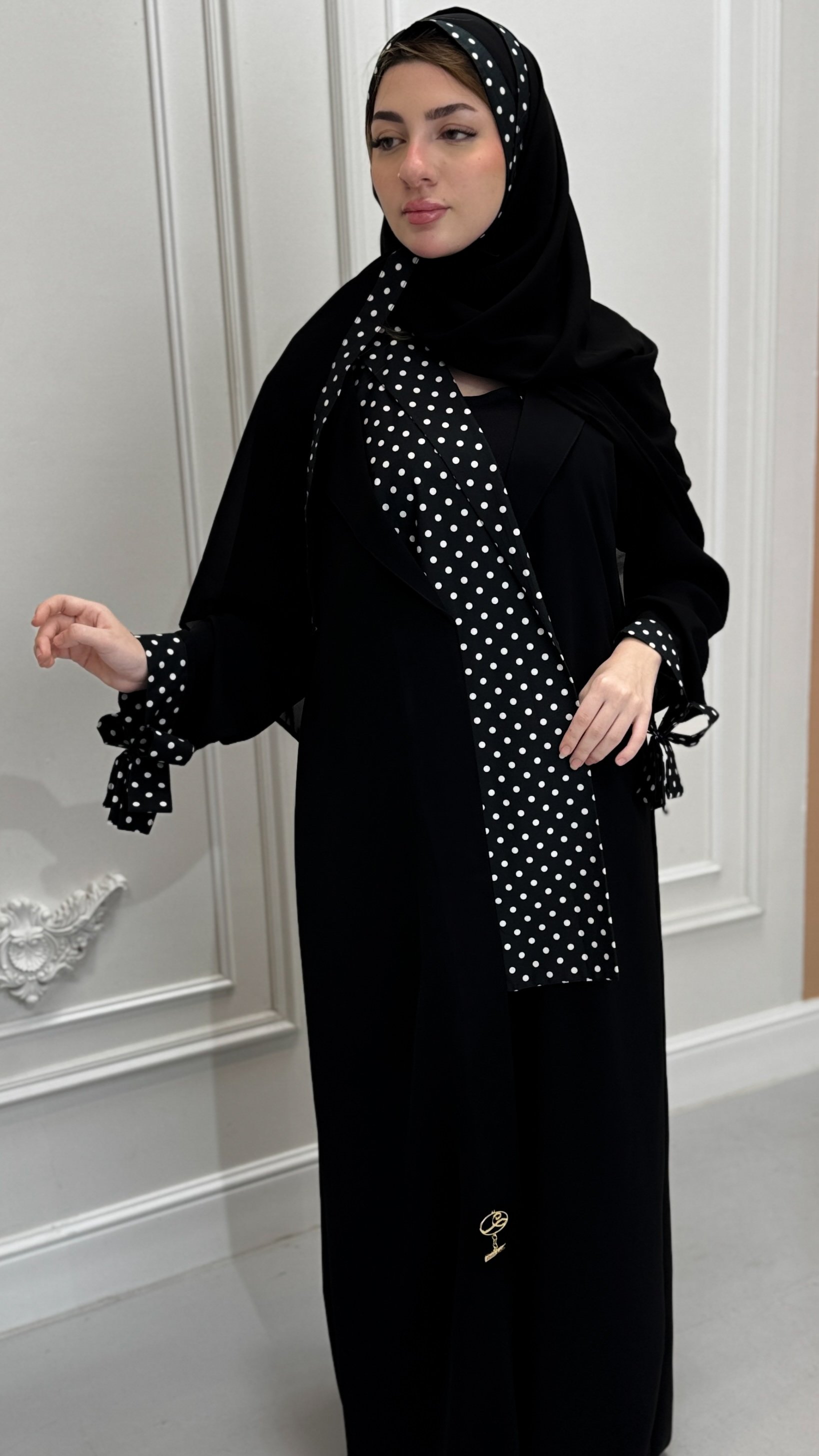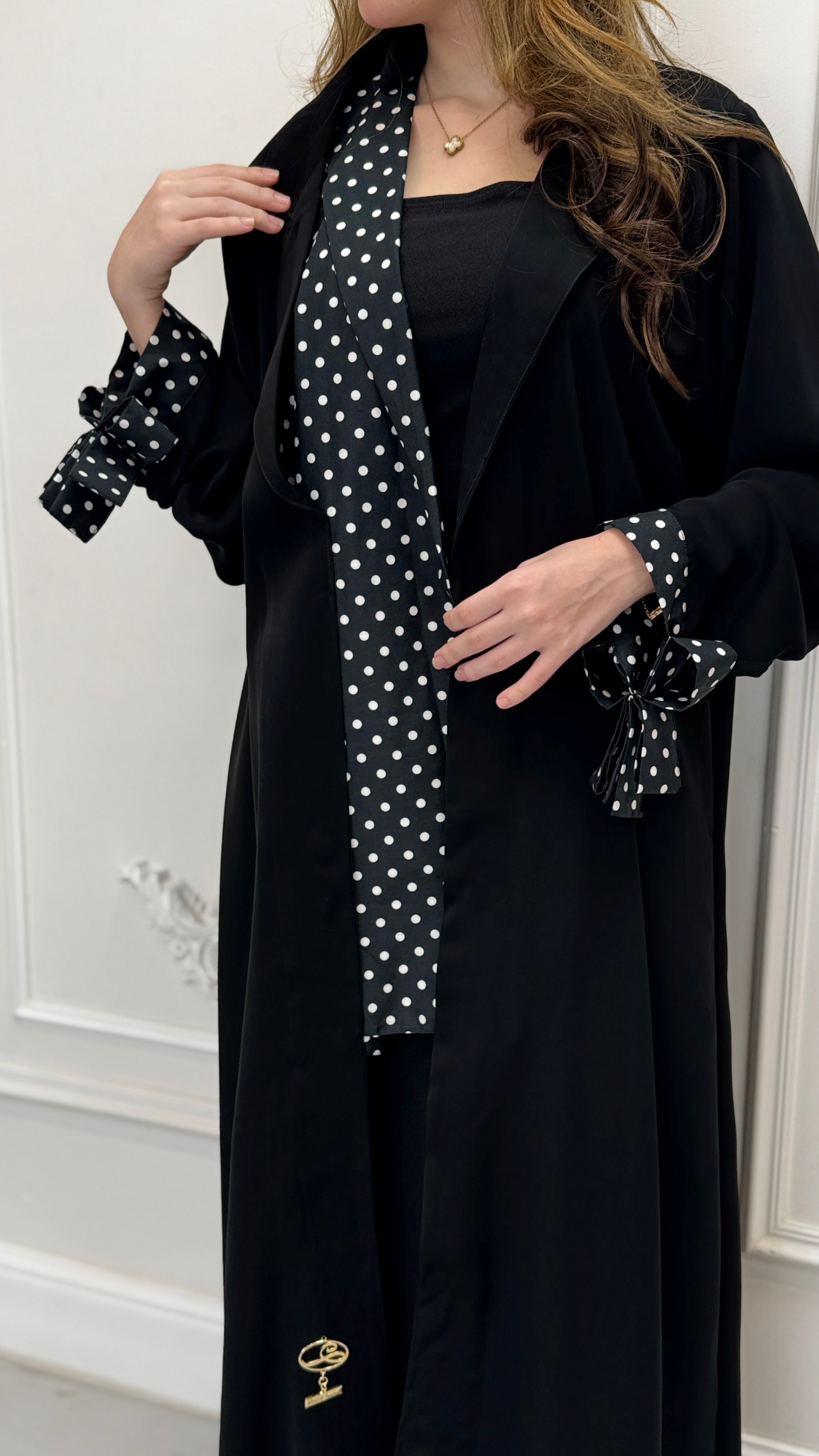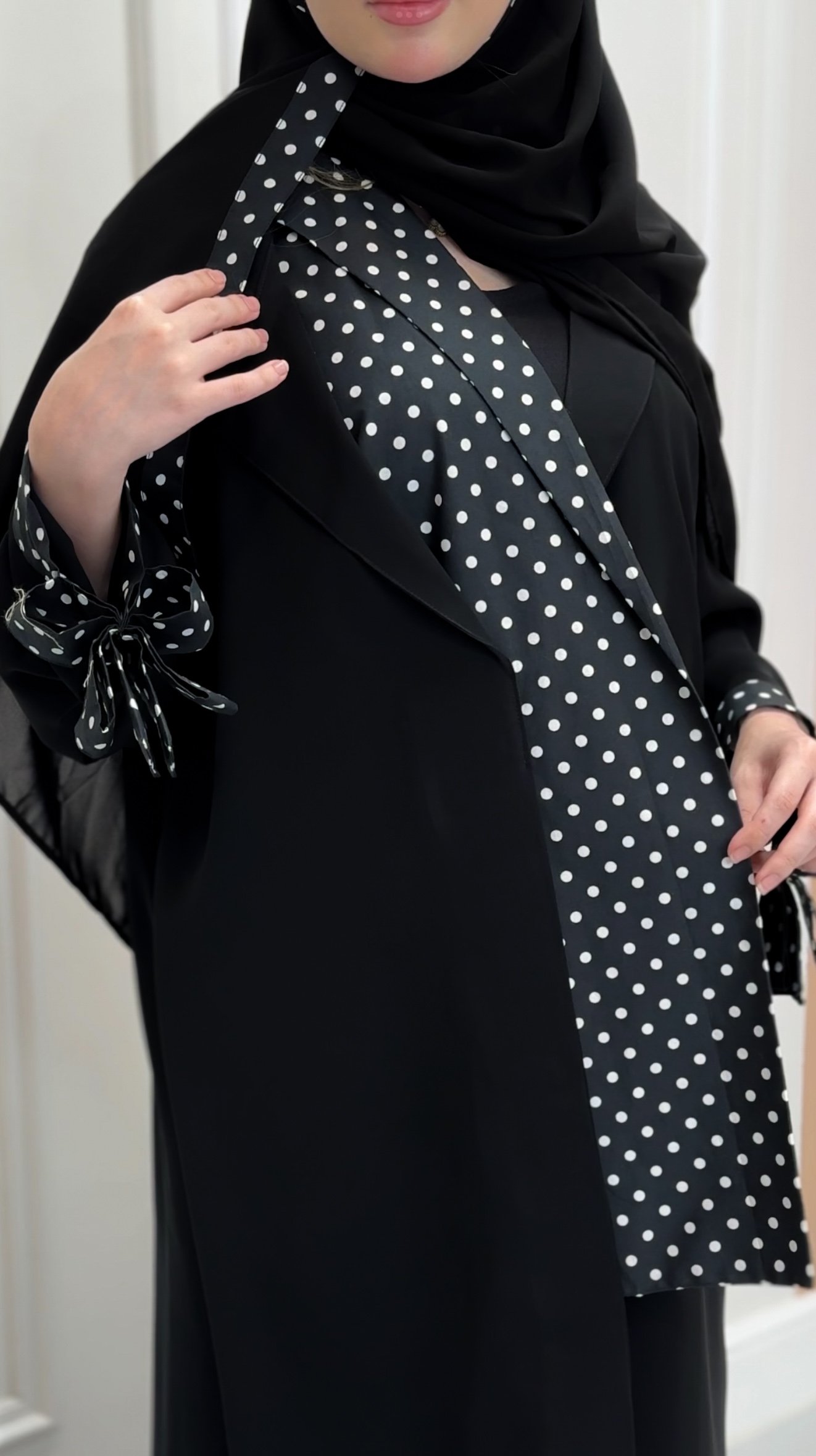 عباية أصايل اختيار ممتاز وذكي وأنيق حيث تجمع بين العباية العملية من حيث قماشها الكريب يمتاز بنعومة فائقة ولا يحتاج إلي كي و مضاف اليه قماش منقط ياباني أضاف اليها اناقة عصرية ومضاف فيونكه مثبتة في الأكمام مما جعلها اكثر اناقة وعصرية