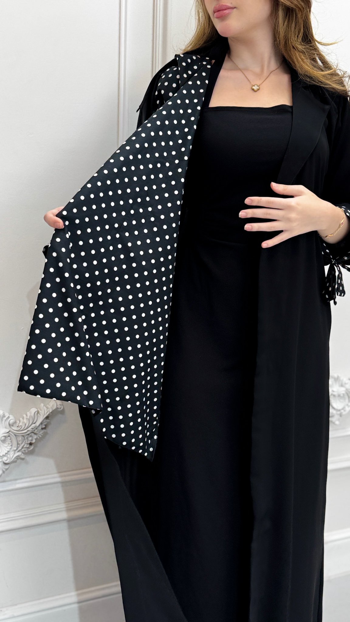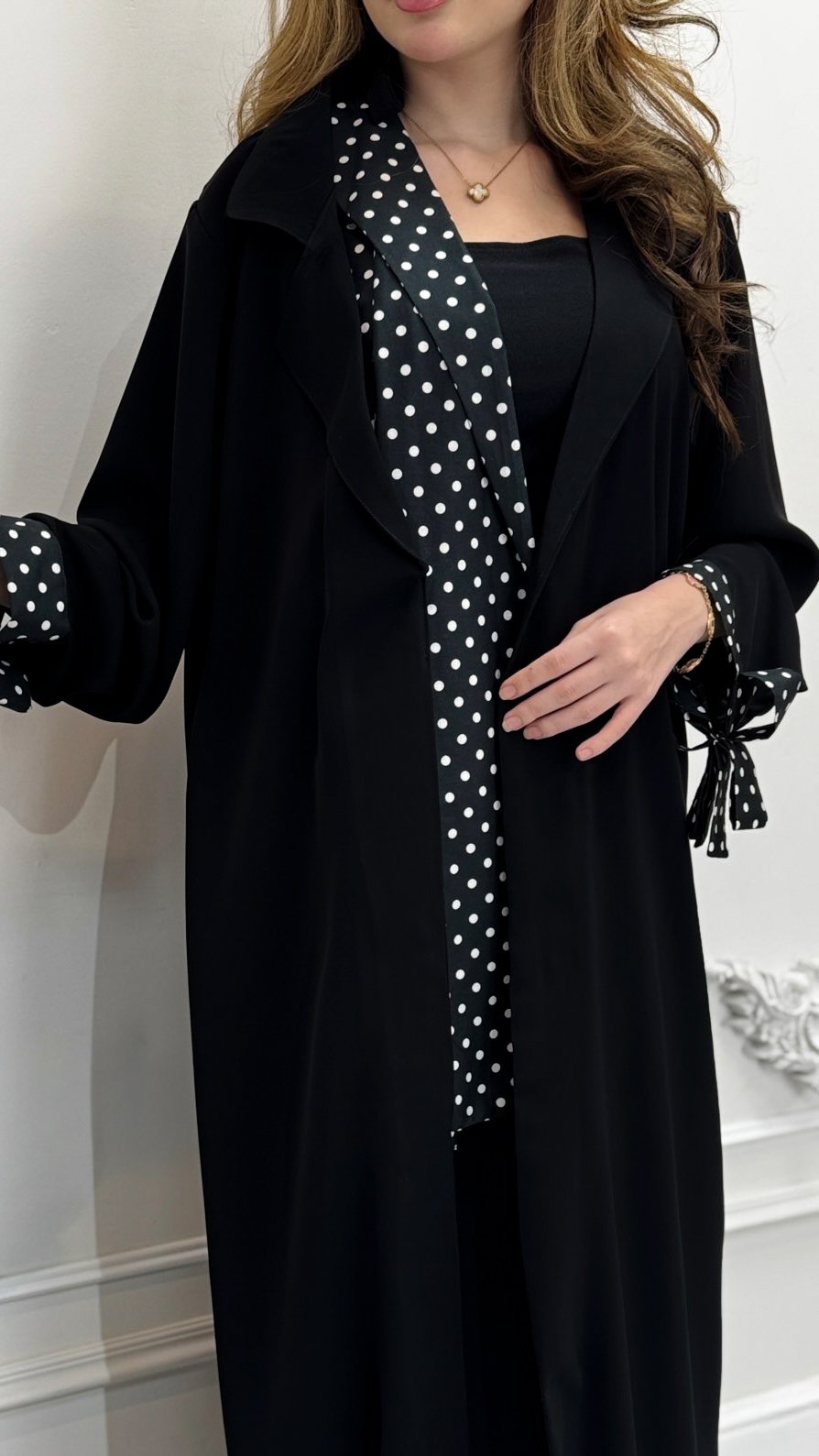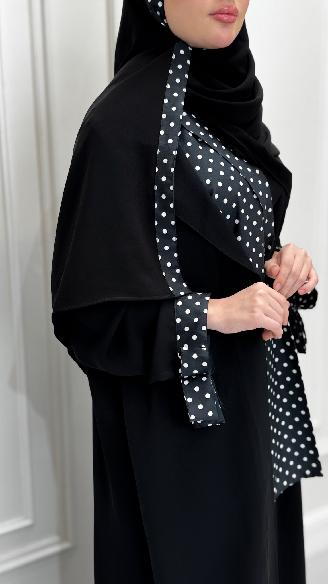 عباية أصايل اختيار ممتاز وذكي وأنيق حيث تجمع بين العباية العملية من حيث قماشها الكريب يمتاز بنعومة فائقة ولا يحتاج إلي كي و مضاف اليه قماش منقط ياباني أضاف اليها اناقة عصرية ومضاف فيونكه مثبتة في الأكمام مما جعلها اكثر اناقة وعصرية