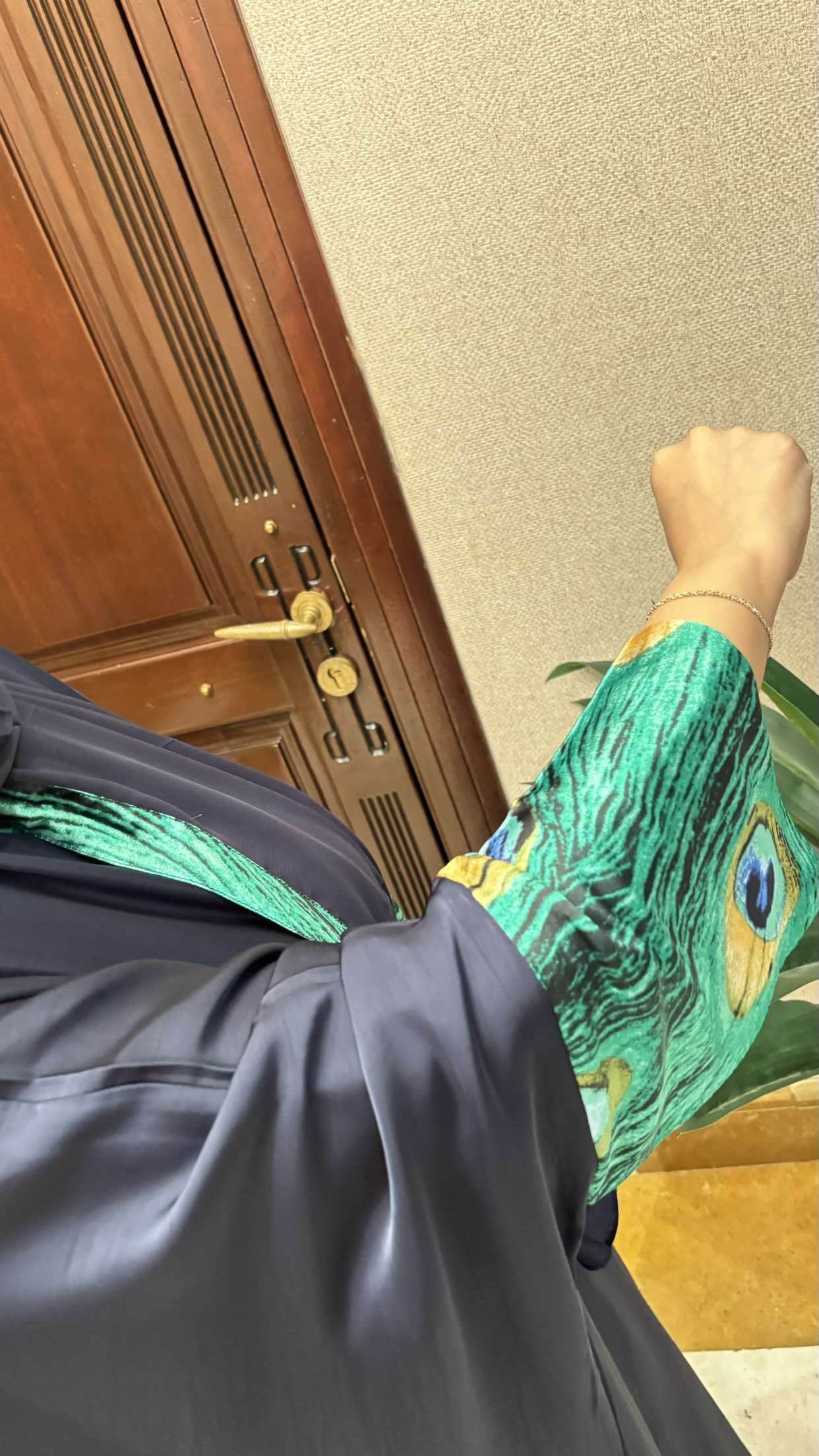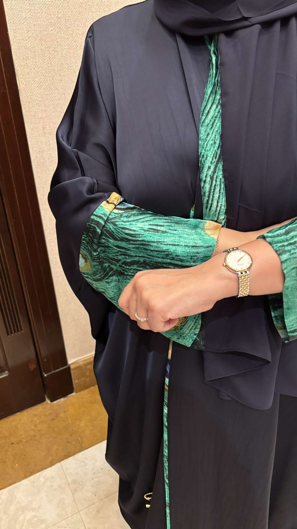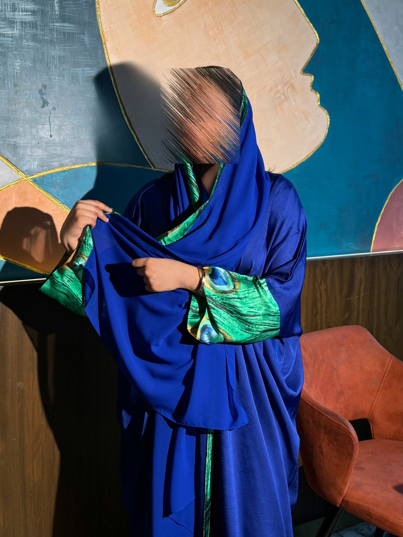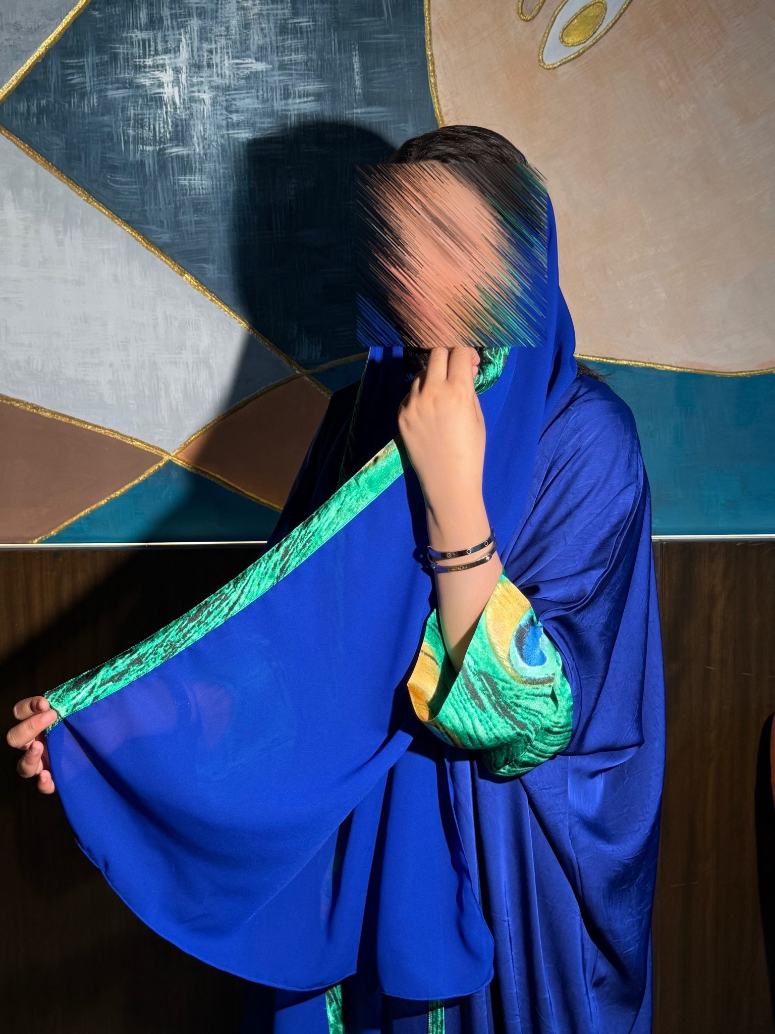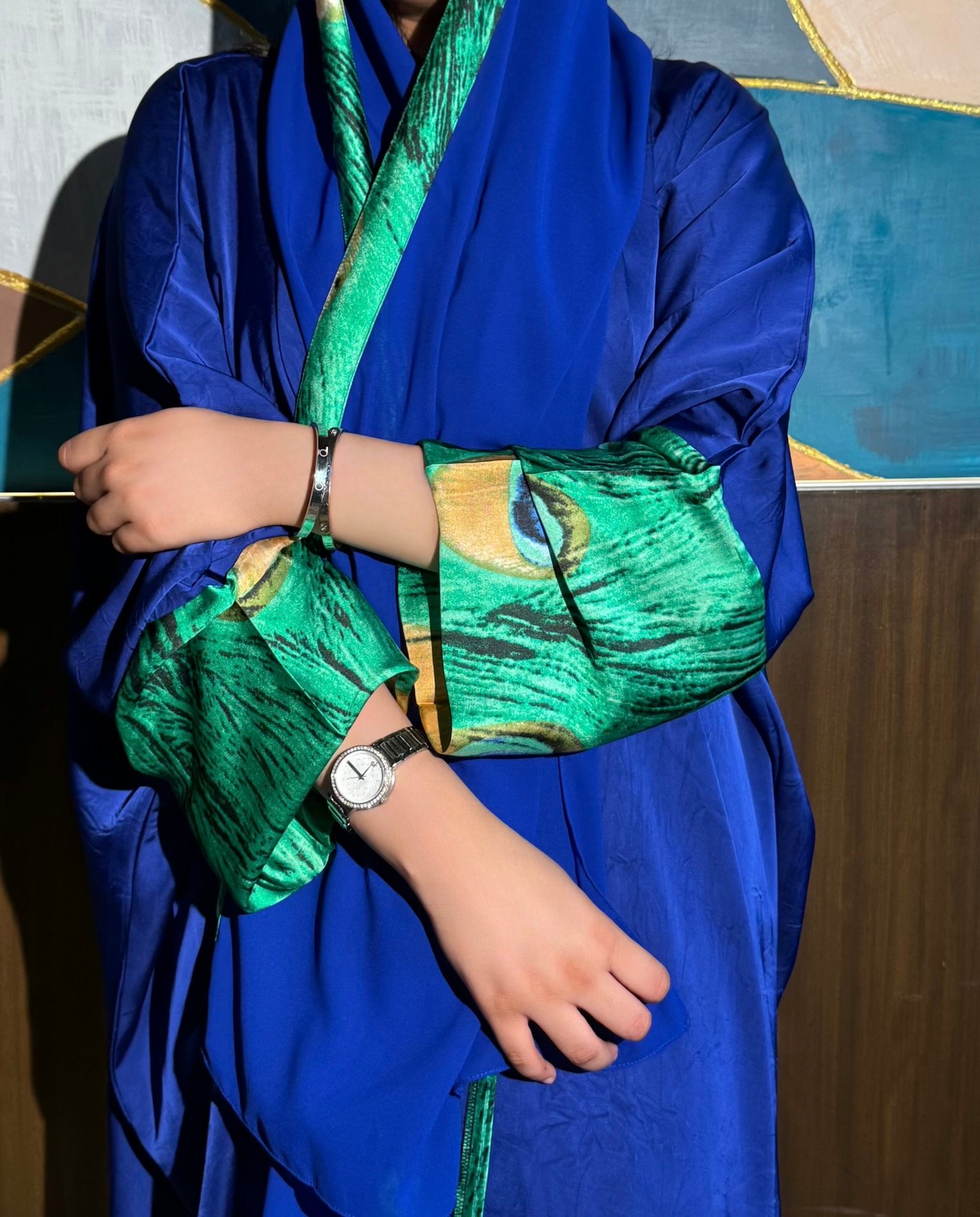عباية الطاووس تجمع بين الفخامة والرقي، مصنوعة من قماش الحرير الطبيعي المغسول مع تفاصيل مشجرة بنقشة الطاووس على الأكمام. تصميم مشلح أنيق يجعلها خيارك المثالي لإطلالة ملكية ومتألقة في كل مناسبة.